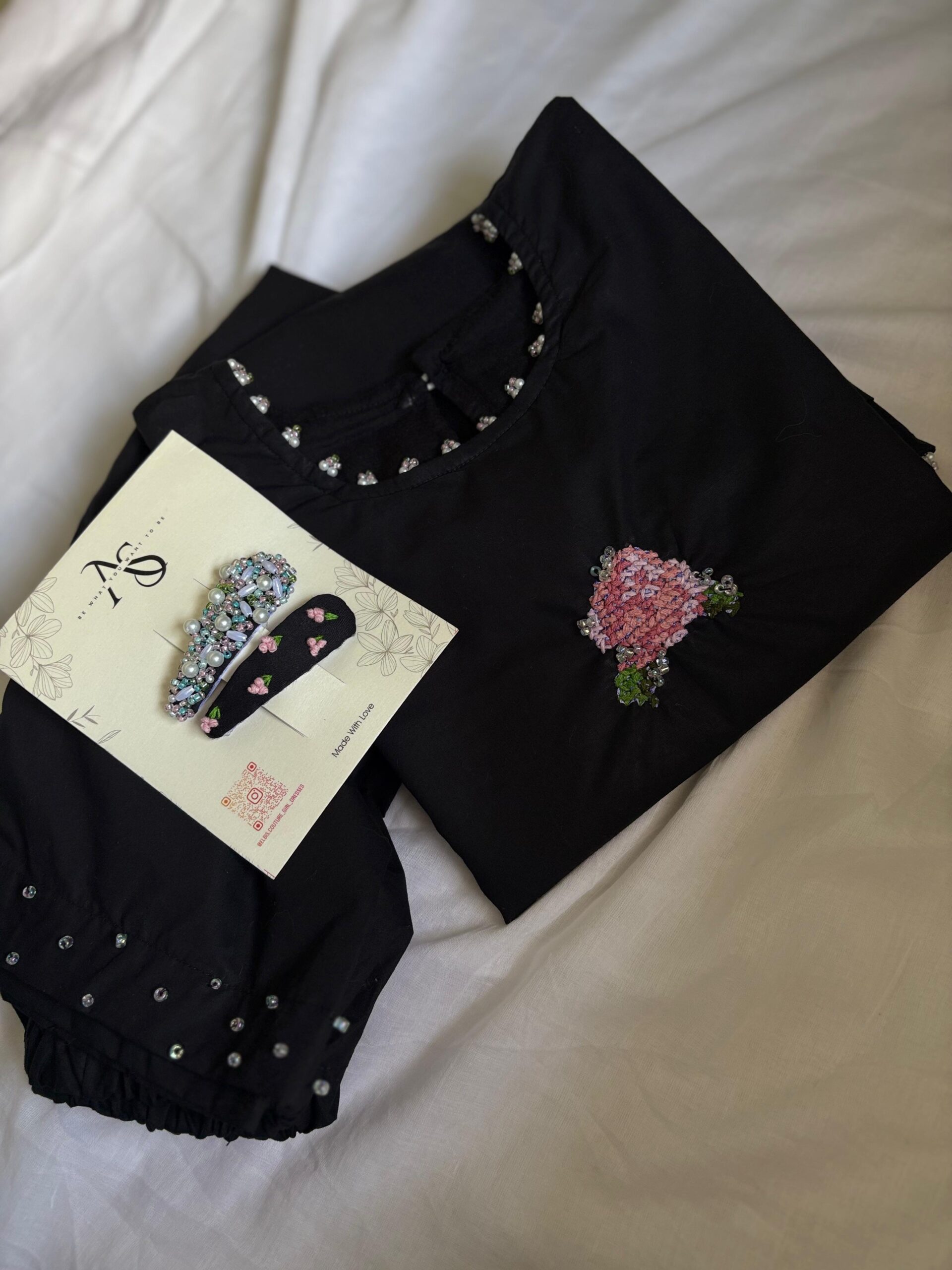 • Step into timeless elegance with our Black Blossom Set a graceful blend of minimal beauty and handcrafted charm.Designed in rich black cotton, the outfit features delicate floral cross stitch embroidery that adds a soft feminine touch, pair with subtle pearl detailing for an understated sparkle. Perfect for festive evening, celebration, or elegant daywear-this piece defines effortless sophistication.