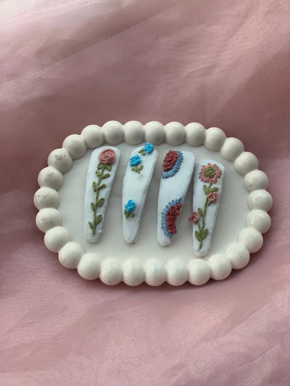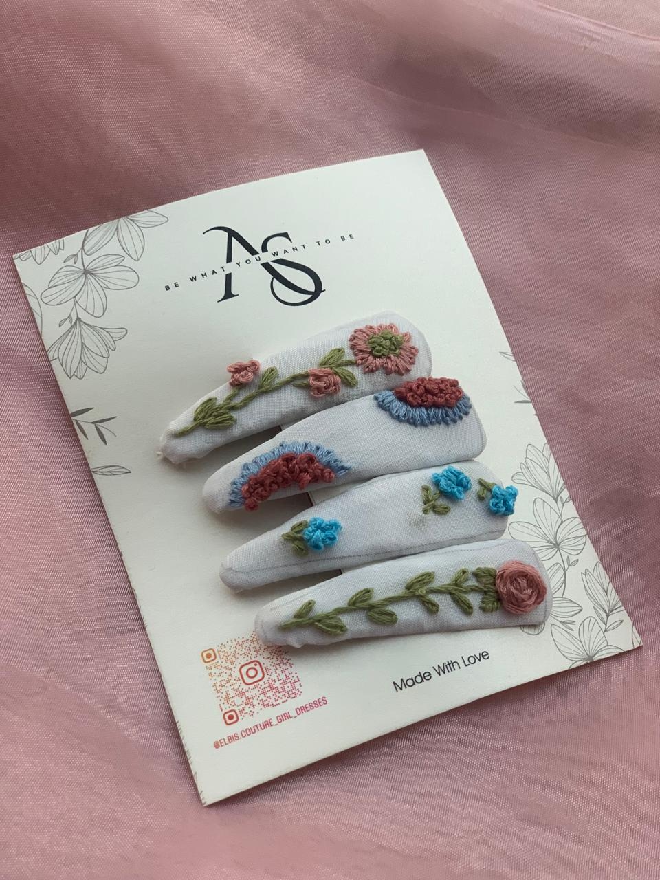 Set includes: 4 embroidered hair clips